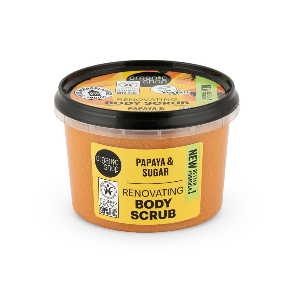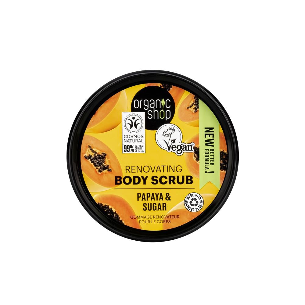 مقشر الجسم العطري برائحة الفواكه مع مستخلص البابايا العضوي والسكر الطبيعي يقشر بشرتك ويجددها، مما يمنحها نعومة وحريرية وتوهجًا صحيًا.